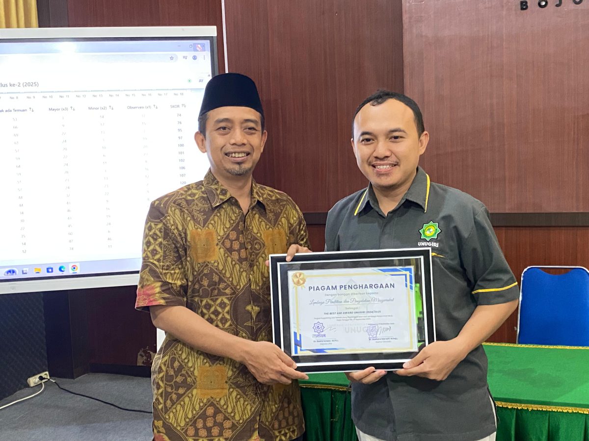 Bojonegoro – Lembaga Penelitian dan Pengabdian kepada Masyarakat (LPPM) Universitas Nahdlatul Ulama Sunan Giri (UNUGIRI) mencatatkan prestasi gemilang dengan meraih penghargaan The Best AMI Award dalam ajang Audit Mutu Internal (AMI) UNUGIRI Tahun 2024/2025. Penghargaan ini diberikan sebagai bentuk apresiasi terhadap unit kerja yang berhasil menunjukkan kinerja terbaik dalam penerapan sistem penjaminan mutu di lingkungan universitas.